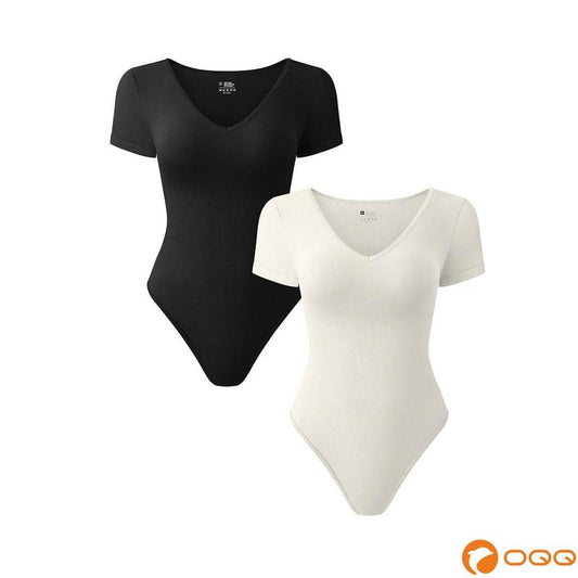 OQQ Women's 2-Piece Ribbed Bodysuit Set - V-Neck Short Sleeve Soft Stretch Fabric